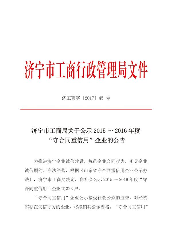 祝賀公司榮獲濟寧市“守合同重信用”企業(yè)
