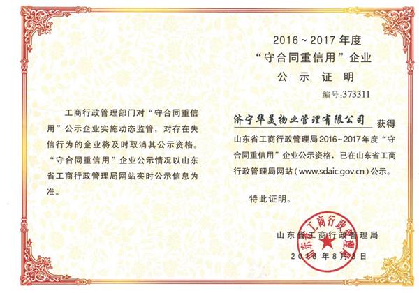 熱烈祝賀濟寧華美物業(yè)管理有限公司榮山東省工商行政管理局2016-2017年度“守合同重信用”企業(yè)公示資格!